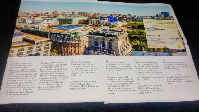 Desde la cima se pueden ver las catedrales católicas y ortodoxas (alemana y francesa), la antigua sinagoga, el edificio rojo del Ayuntamiento, Alexanderplatz -plaza central de la ciudad-, la torre de Televisión, los edificios supermodernos, la Puerta de Brandeburgo y los diferentes sectores del propio Parlamento, que es un museo en sí mismo.