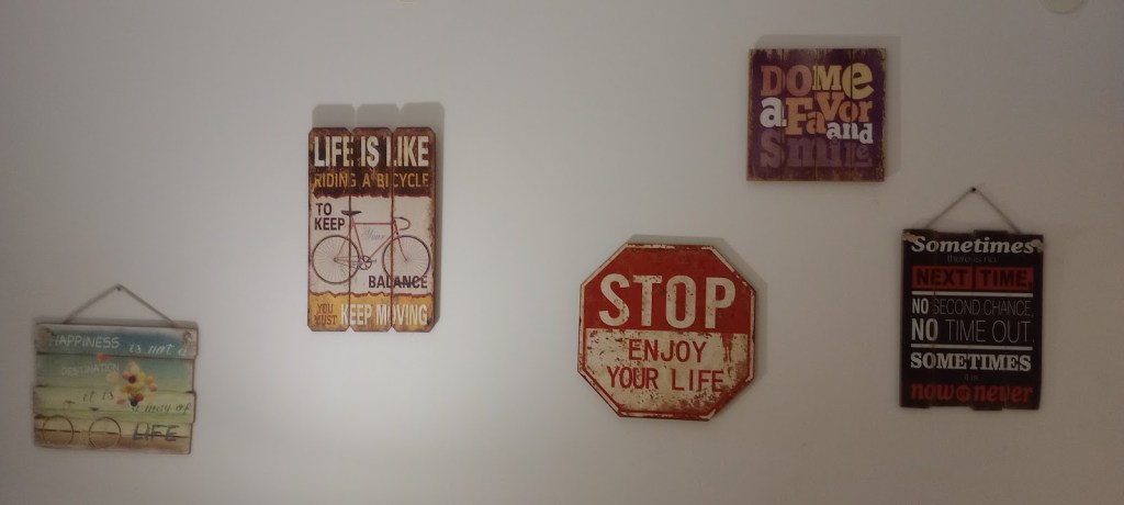 El hall del alojamiento está en el subsuelo. Tiene un sillón grande, con su mesa ratona, tres mesitas para dos personas, con sus sillas, una tele gigante y algunos cuadros. Los carteles son un derroche de optimismo en una ciudad tan sufrida: