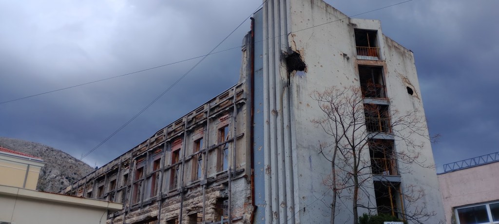 En el trayecto de vuelta hacia el alojamiento me encuentro con los edificios a medio construir que había visto antes: en realidad, son edificios a medio destruir. En medio del acecho, los croatas bombardearon y tirotearon todo lo que pudieron. Algunas construcciones quedaron en pie, con las balas incrustadas en sus paredes, con una destrucción inconclusa.