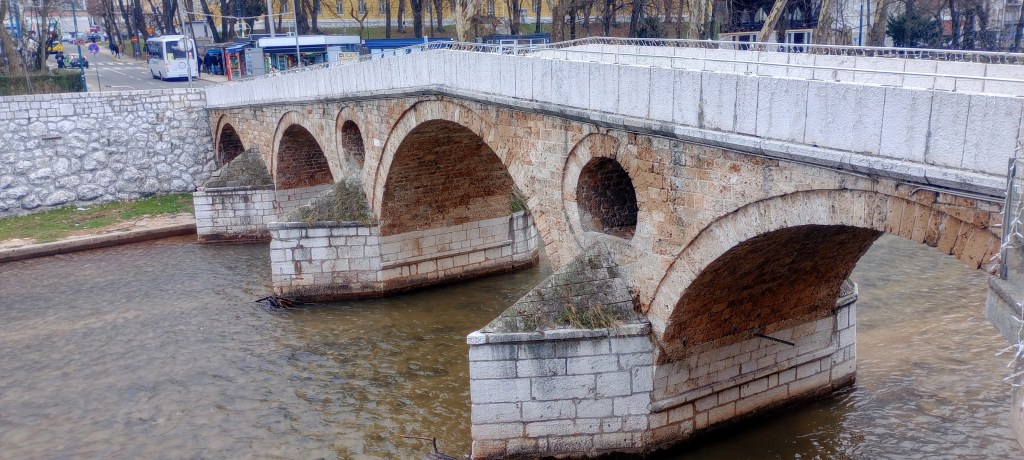 El puente, construido en piedra, reemplazó a uno anterior de madera y lleva el nombre de «Latino» por las comunidades católicas asentadas originalmente en la orilla norte del Miljacka