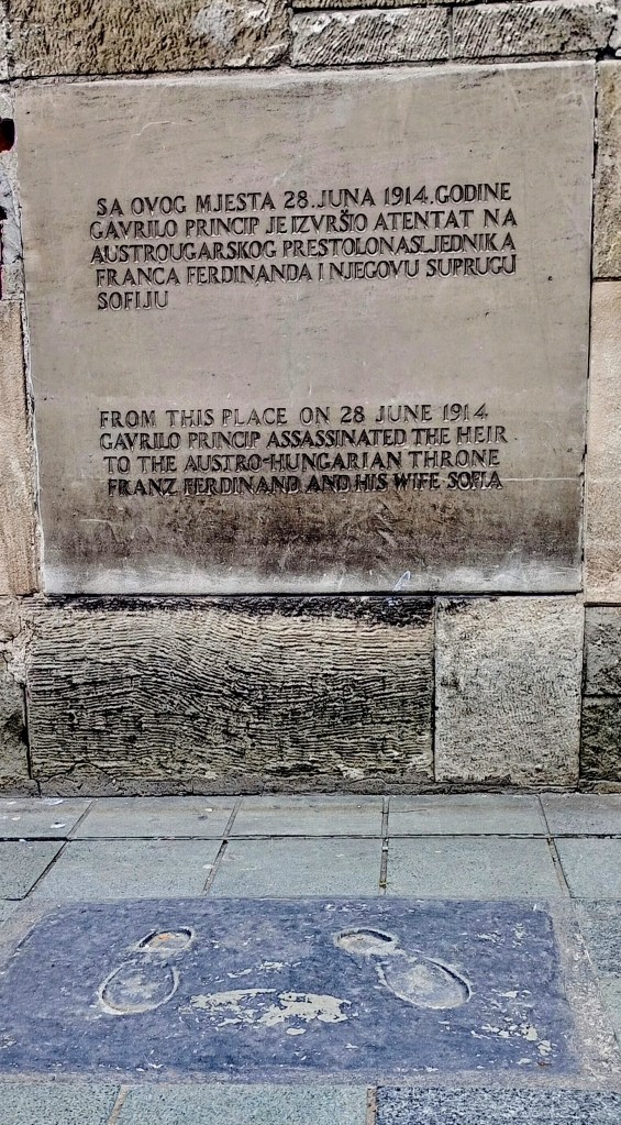 Muy cerca está el Puente Latino, que cruza el río Miljacka. A pasos de ese cruce, Gavrilo Princip asesinó al heredero del Imperio austrohúngaro, Francisco Fernando (Franz Ferdinand), y a su esposa, Sofía, con dos disparos. El episodio, ocurrido el 28 de junio de 1914, activó la cadena de hechos que llevó a la Primera Guerra Mundial.